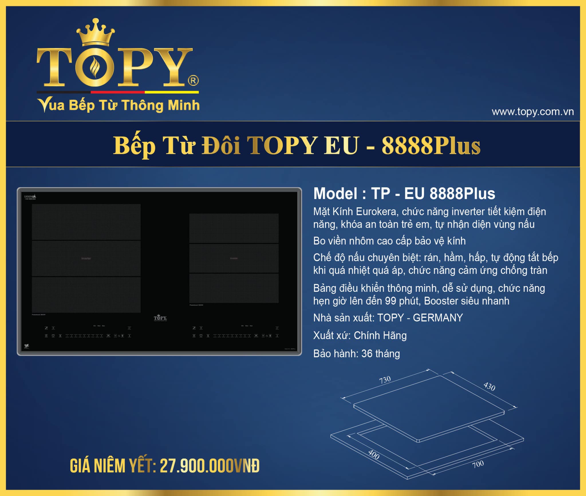 Bếp từ Topy EU-8888 PLUS là mẫu bếp từ nhập khẩu nguyên chiếc từ Đức mới nhất mang thương hiệu Topy có mặt tại thị trường Việt Nam. Sản phẩm sở hữu thiết kế vượt trội và những tính năng thông minh mang đến nhiều tiện ích hấp dẫn cho người dùng. Hãy cùng Bếp Thái khám phá mẫu bếp từ Đức đôi Topy EU-8888 Plus cao cấp này nhé!